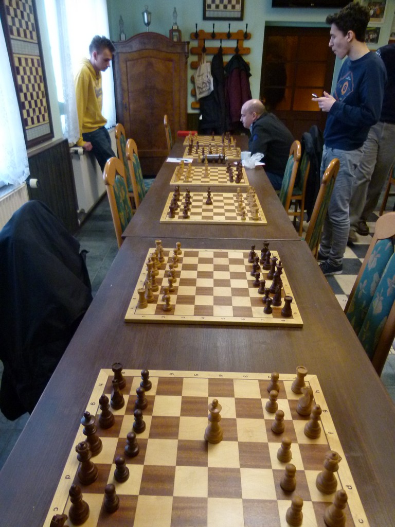 Während wir auf das Ende der Karenzzeit warteten, entwickelten sich an den übrigen Brettern spannende und umkämpfte Partien. Die erste Entscheidung gab es am 7. Brett. Nach etwa 2 Stunden Spielzeit und 18 Zügen musste Christian die Waffen strecken. Im Abtauschsystem der spanischen Partie gab er schnell den e5-Bauern nicht ganz freiwillig. Dafür schwächte der Weiße aber mit h3 und g4 die Schutzstellung seines Königs. Mit Einschränkungen sollte sich das für Schwarz spielen lassen, aber Christian spielte ungenau und ließ sich zusammenschieben. Die einzige aktive Figur, die Dame, verirrte sich schließlich in einem überhasteten Angriffsversuch am Königsflügel hinter den feindlichen Linien und wurde bald gefangengenommen.