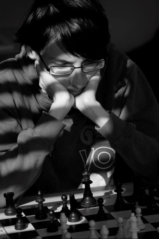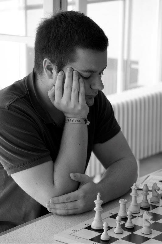Kurze Zeit später war Nicolas' Partie friedlich beendet. Nach bequemem Eröffnungsverlauf mit frühem Damentausch kompensierte sein Läuferpaar und Gegenspiel am Damenflügel jederzeit die schlechtere Bauerstruktur. Unter zwischenzeitlichem Bauernopfer wickelte er folgerichtig in ein remises Turmendspiel ab.