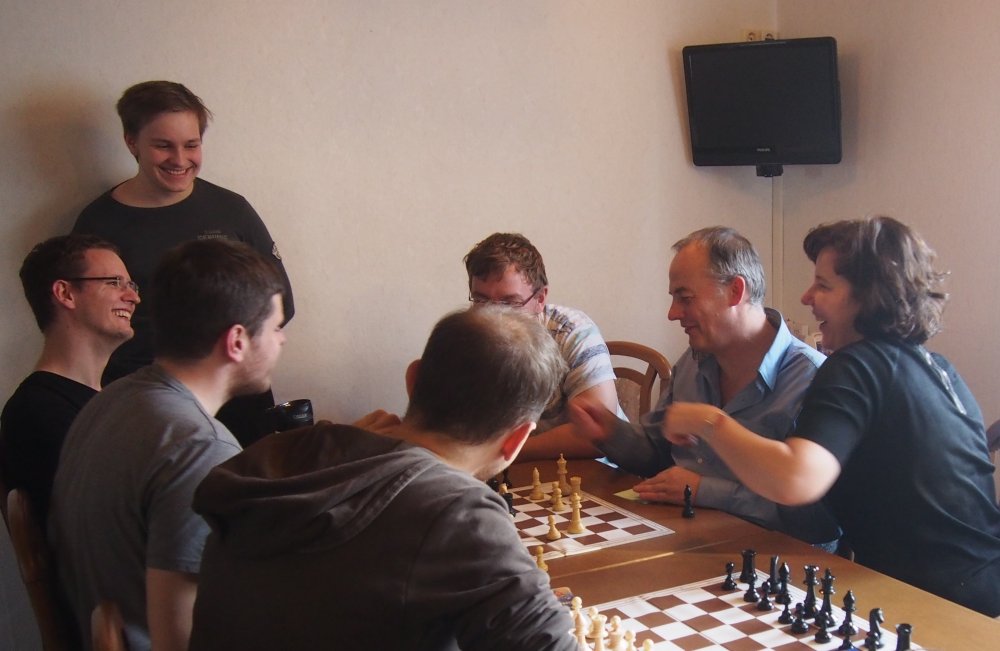 Mikly ersetzte Stefan an 8 und spielte einen englischen Aufbau, in dem er schon bald mit dem g-Bauern nach vorn stürmte. Das hinterließ jedoch Schwächen, und nachdem Mikly in der Zeitnotphase gute Chancen ausließ, kam der Gegner zum Zug. Er ließ sich zwar ein Qualitäts- gefolgt von einem Damenopfer entgehen, aber auch die triviale Fortsetzung war ausreichend.
