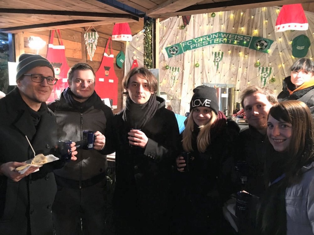 Unser Dezember-Punktspiel sollte gegen Grün-Weiß Piesteritz bestritten werden. Dem Winterwetter und der weiten Anreise geschuldet, trafen sich unser Neuzugang Julia samt ihrem Ehemann René, Patricia, Reyk, das Zweigestirn Christian und Frido (besser bekannt unter dem Namen Chrido) und der Berichtschreiber Münzi bereits am Samstag in der Lutherstadt. Nach kurzer Stärkung von der weiten Anreise auf dem Wittenberger Weihnachtsmarkt mit Glühwein vom Stand der Fußballabteilung des Grün-Weiß Piesteritz und Pferdekeksen des örtlichen Reitvereins ging es in die Indoor-Strandbar Coco. Zu Cocktails und "Heißer Orange" wurden der Tradition folgend die Codenamen durch den Raum gerufen und zumindest versucht die Attentäter zu umschiffen. Nachdem zu fortgerückter Stunde endgültig geklärt war, dass sich blau und schwarz im Schummerlicht nicht immer ausreichend unterscheiden ließen und Brustharnische in Kohle gehärtet wurden, verabschiedete man sich in die Nacht.