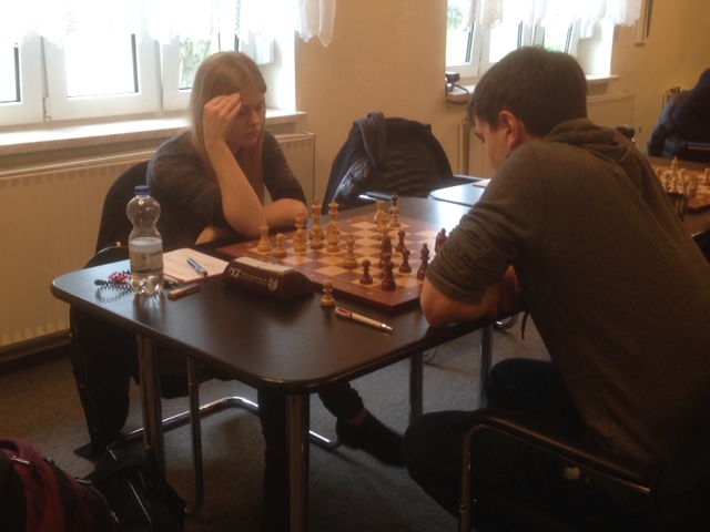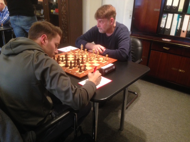 Chevalier stand mit Schwarz gegen Dirk Wildenrath sehr gut. Das Feld d4 konnte er sein Eigen nennen und er hatte die Möglichkeit, eine Stellung zu bekommen, in der ein gestützter Springer auf d4 den schwachen weißen Läufer auf g2 dominiert. Er nahm auf d4 mit einem Bauern- dadurch war das Feld nicht mehr für einen Springer oder eine andere Figur begehbar. Weiß gelang es mehr und mehr, die Schlagzahl zu erhöhen und konnte einen Punkt einstreichen (Anm. der Redaktion: Chevalier ließ jedoch zum Schluss noch ein forciertes Remis gegen den starken Gegner aus).