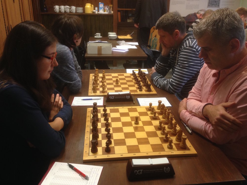 Nico schoss dann die Führung. Simon wählte gegen Holländisch das Staunton-Gambit, obwohl Nico nach seiner Aussage taktisch besser ist als er. Jedenfalls entwickelte sich eine flotte Partie, wo ich schnell nix mehr verstand. Nico entfachte einen Angriff auf den weißen Monarchen und kassierte eine Figur, musste aber auf seinen eigenen Monarchen achtgeben, der sich noch in der Mitte des Schlachtfeldes befand. Nachdem ein banger Moment überstanden wurde, verschwanden die Damen vom Brett. Am Ende überschritt Simon gar die Zeit.