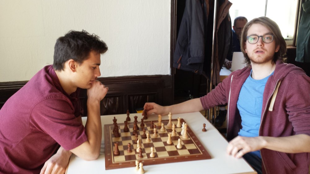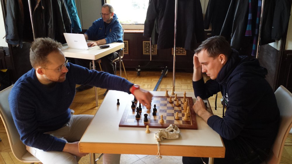 Und sogar am Brett hat es der Schütze heute eilig und gleicht nach Manuels Wolga-Fehler im 15. souverän aus. Tischpärchenpartner Brain lässt sich von dem hohen Tempo anstecken und entlässt Spielpartner Markus nach 17 Zügen in einer Nebenvariante des Abtausch-Caro-Kann trotz etwas ungenauem gegnerischen Lb5 eingedenk einiger eigener Schwarzfelderschwächen ins Remis.