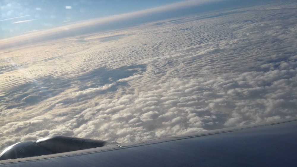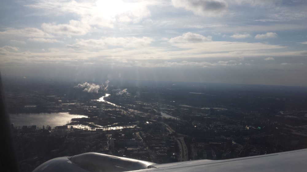Da kommt die erste Durchsage: Der Leipziger Flughafen sei aktuell geschlossen, weil die Landebahn noch enteist werden müsse und würde aber um 8 Uhr wieder öffnen und hätte uns dann für 8.10 Uhr vorgesehen, also 30 Minuten später als planmäßig. Nun gut. Also ziehen wir ein paar Schleifen. Etwas anzufangen lohnt noch immer nicht, das Kleid der Erde sorgt für visuelle Andacht. Eine Weile später kommt die nächste Durchsage: Der Leipziger Flughafen bleibe noch geschlossen und würde erst eine weitere halbe Stunde später öffnen, wir wären nun also zur Landung um 8.40 Uhr vorgesehen. Hmm .. nun ja .. die sonnendurchflutete Wolkendecke sieht immer noch fantastisch aus. Eine Weile später dann wieder der Pilot: Die Öffnung des Leipziger Flughafens verzögere sich weiter. Da aber die Füllmenge im Treibstofftank endlich sei, flögen wir nun Berlin-Tegel an.