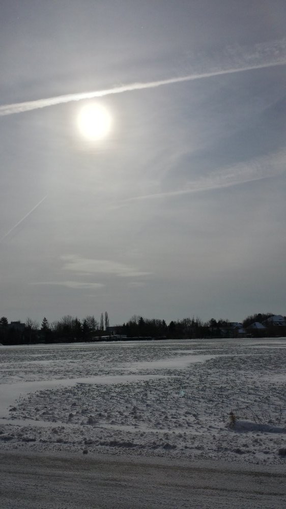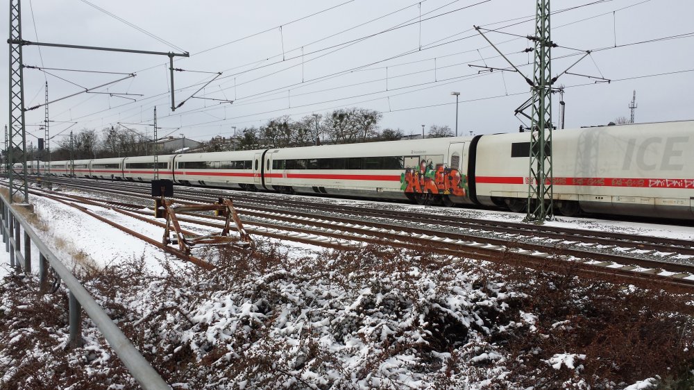 Auf geht's. Doch noch Winterlandschaft, wenn auch ebenerdig. Die Zeit nutzen jedoch kann ich erneut nicht, mir bleibt immerhin genug Platz für wechselnde Stehpositionen; die gute Stunde erwartete Fahrzeit ist so auszuhalten. Doch, der Zug verlangsamt auf etwa halber Strecke und kommt schließlich zum Stehen. Ein paar Minuten später die Durchsage: Der Bahnhof Bitterfeld sei voll mit Zügen, unsere Einfahrt dort würde sich voraussichtlich um 15 Minuten verzögern. Die Zeit verstreicht. Aus Halle kommt von meinen weiterhin mutig abholwilligen, mit eindeutig zu vielen Frühstücksbrötchen bestückten Gastgebern die Nachricht, eine Verspätung von 33 Minuten sei bekanntgegeben worden. Die Zeit verstreicht. Auch der Lokführer meldet sich wieder und bestätigt. Die Zeit verstreicht. Aus dem Internet kommt eine neue Prognose, die von 1 Stunde 14 Minuten ausgeht.
