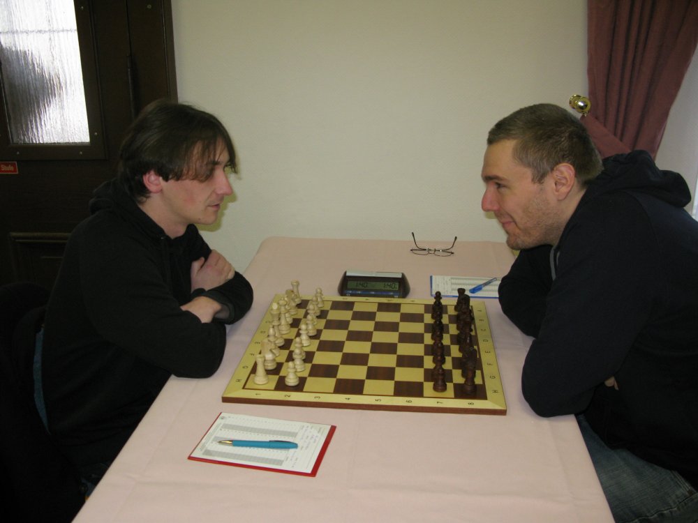 Parallel dazu schiebt Reyk Ralf Häntsch förmlich zusammen. Während Reyk als Schwarzer einen soliden Springer auf e3 postiert, verschanzt sich die weiße Dame neben dem rochierten König auf g1. Schließlich geht bei Weiß taktisch ein Springer verloren. Ralf versucht zwar noch zu tricksen, verliert dabei aber nur noch mehr Material und gibt auf.