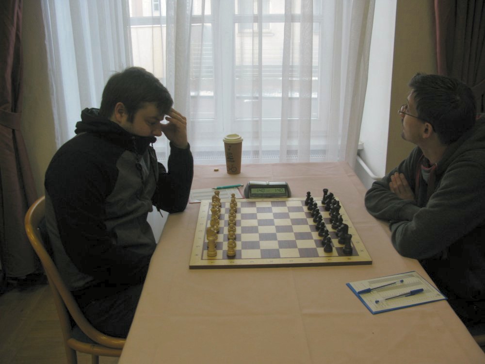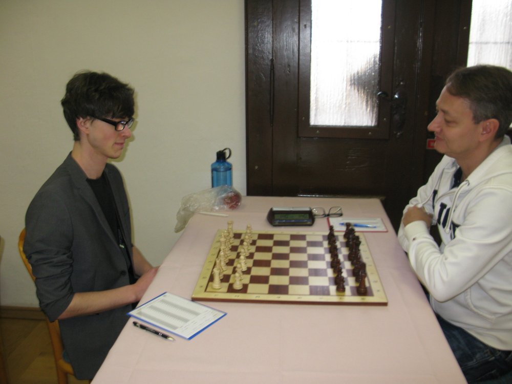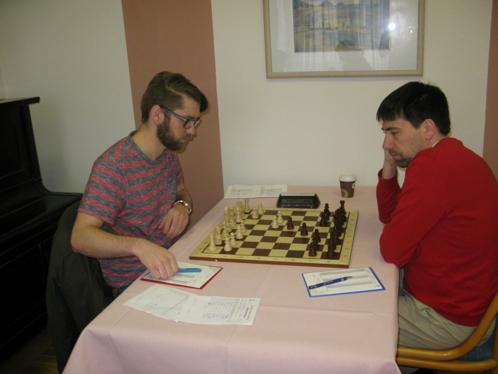 Die erste Entscheidung fiel nach etwa 3.5 Stunden bei Christian. Ich wunderte mich schon sehr, dass nicht Christian die Glückwünsche galten, sondern seinem Gegner René David, rechnete ich doch fest mit einem Sieg. Anscheinend fand Christian aber kein Durchkommen in der schwarzen Stellung, während René seine Figuren nach und nach aktivieren konnte. Am Ende wurde Christian wohl noch taktisch ausgekontert. Schade!