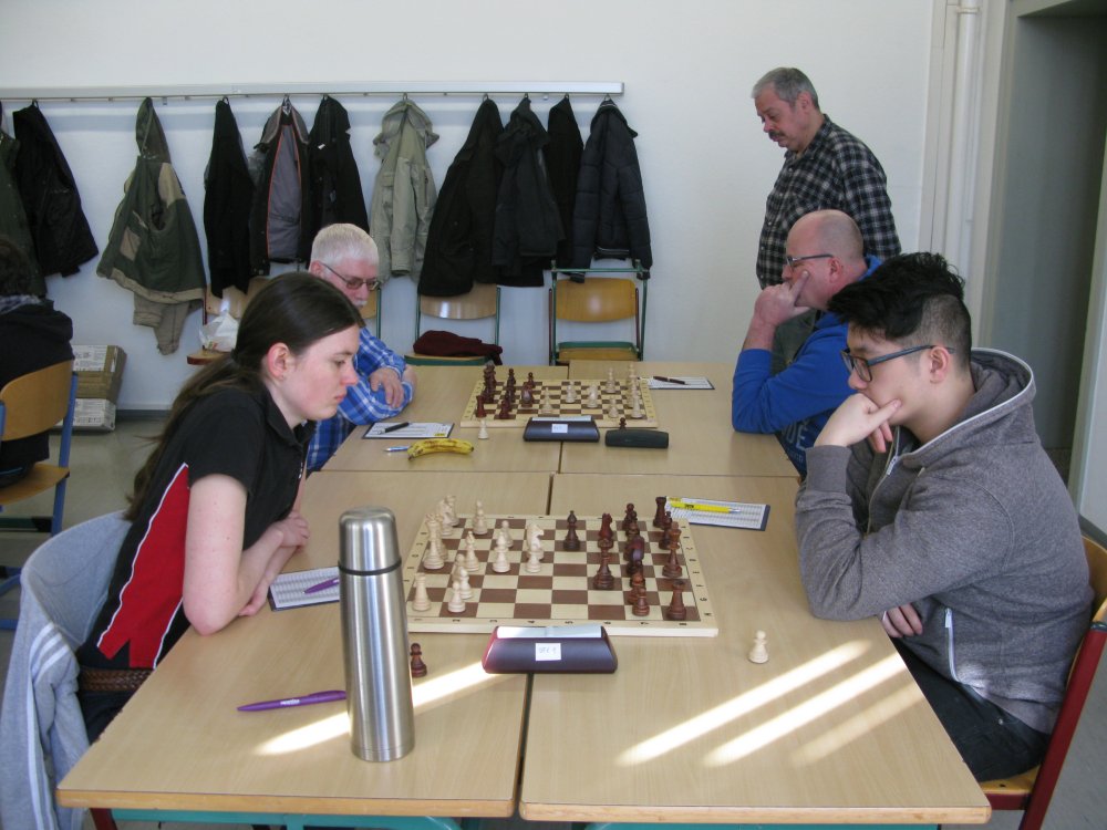 Johanna war die dritte im Bunde der entschiedenen Partien. Hier wurden zu Beginn der Partie so einige Figuren wie im Tauschrausch.... äh... getauscht. In einem relativ unspektakulären Endspiel mit Türmen und Springern ließ sich Johannas Gegner in eine Fesslung treiben, welche einen Figurenverlust zur Folge hatte. Winning by pinning! 2 – 1 für uns also.