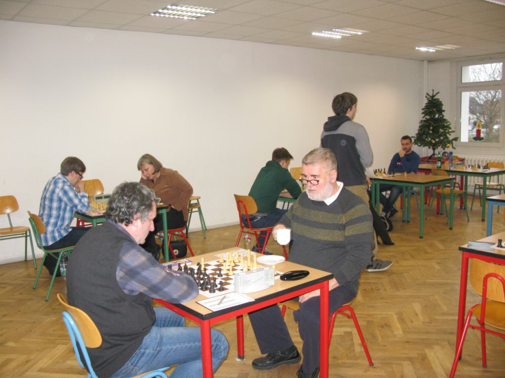 Von der Mittelachse habe ich leider gar nicht soviel mitbekommen, aber Christian S. hatte eine Maroczy-Stellung mit Weiß erreicht. Ich glaube, er war ein wenig Druck ausgesetzt, konnte sich dann aber fangen und das Remis mitnehmen.