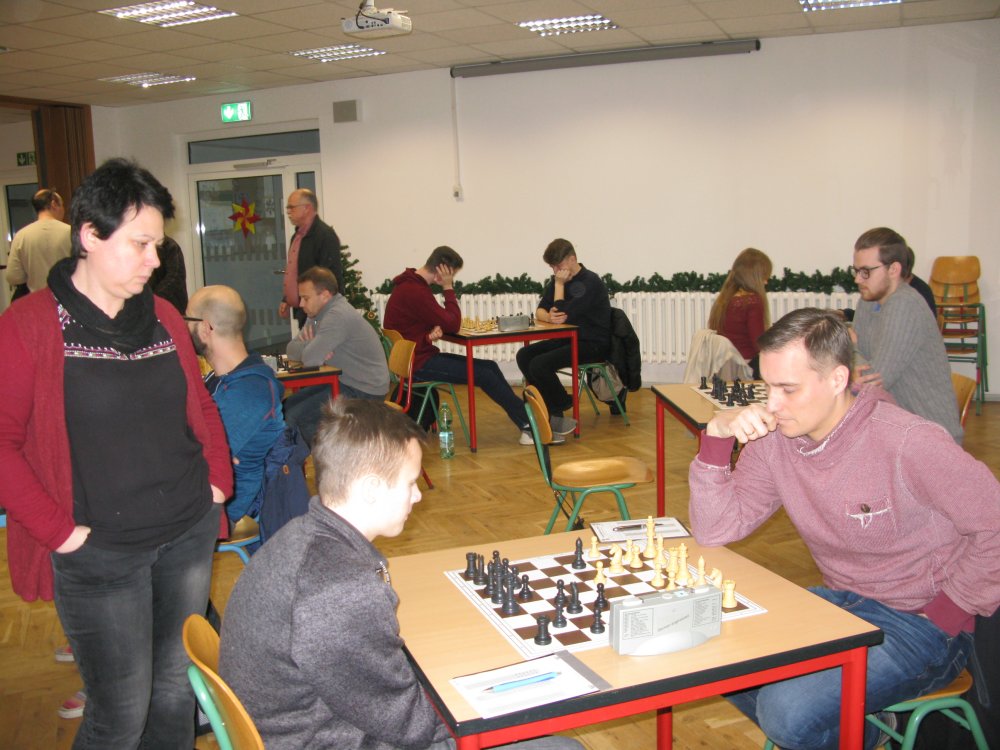 An allen Brettern waren spannende Partien zu beobachten. Meins war vermutlich noch das Uninteressanteste, da ich in der Eröffnung eine kleine Falle aufstellen konnte. Weil sich Tatjana nicht mehr an die genaue Zugfolge erinnern konnte und im weiteren Verlauf etwas optimistisch gespielt hat (das Winawer-mäßige Doppelbauernopfer auf g7 und h7 war etwas viel) konnte ich schnell eine Gewinnstellung erreichen, die ich auch nach Hause fahren konnte.