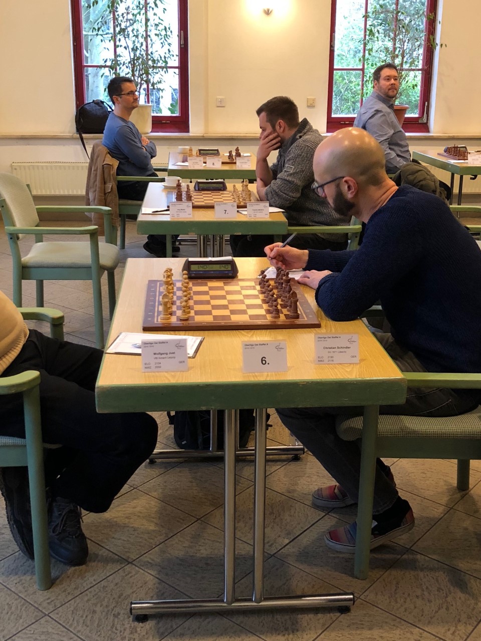 Schindli musste sich mit erstens f4 auseinandersetzen und fand da auch nicht gerade den besten Aufbau, wodurch er von Anfang an im Verteidigungsmodus war. Bei Frido kam Russisch aufs Brett. Durch einen schnellen Damentausch war hier ebenfalls nicht so viel los. Christian an 8 konnte zwar bequem ausgleichen, mehr aus der Stellung zu holen, schien aber auch schwierig.