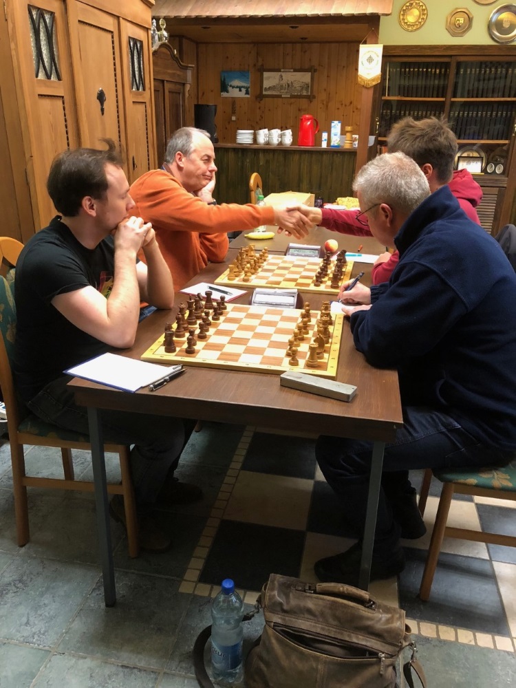 Mir selbst gelang ein leichtes Wohlgefühl aus der Eröffnung, dann aber ließ ich das Hauptmotiv f4 wiederholt aus, wonach die Partie endgültig in die sichere Remisbreite zurückdriftete. Erst im Endspiel vergaloppierte sich Schwarz sprichwörtlich und geriet damit in eine zu passive Stellung, wo mit einem Qualitätseinsteller in Zeitnot der Partiebeendigungsbeschleuniger gefunden wurde.