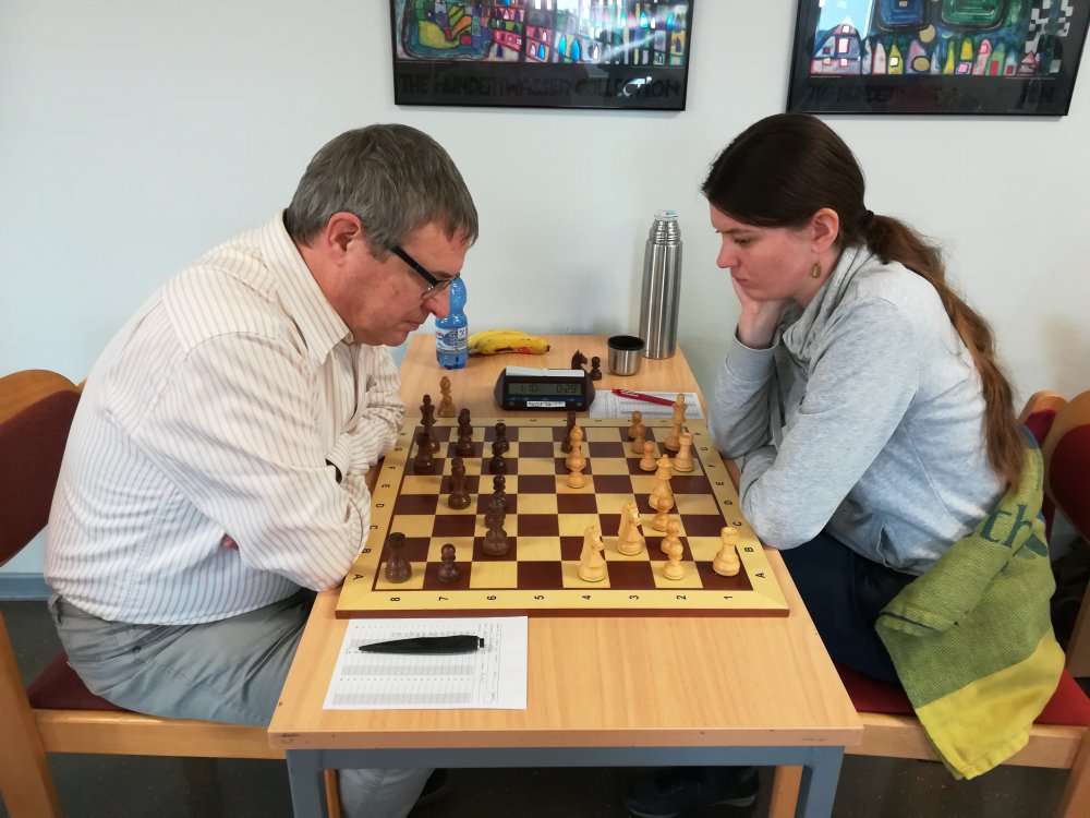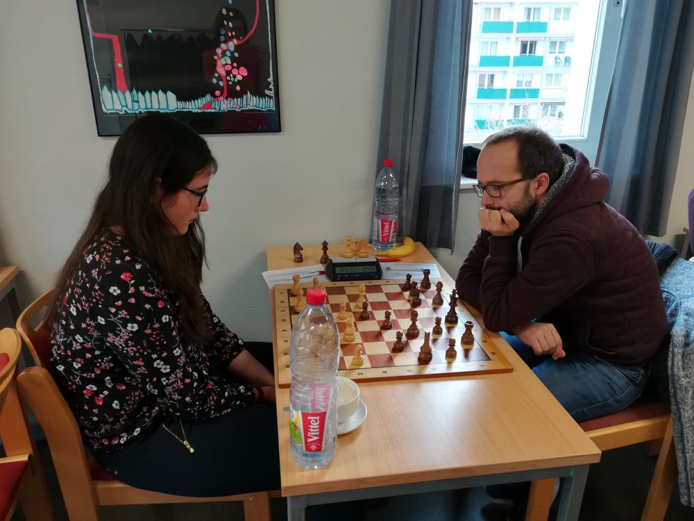 Unsere Kämpferin Elina quälte sich am längsten von uns allen. Eine spanische Nebenvariante, lange ausgeglichen, spitzte sich nach 20 Zügen im Rennen von Freibauern zu: Tatsächlich gab es für beide Seiten einige nichttriviale Gewinnwege - die Weisheit der Retrospektive. Leider ging im Handgemenge stattdessen eine Qualität verloren... doch Weiß blieb zäh. Alle Freibauern waren noch gefährlich und Schwarz noch lange nicht zuhaus. Als besonders tragisch stellte sich heraus, dass Elina dann die richtige Remisidee besaß, diese aber - im 42. statt im 41. - einen Zug zu spät ausführte. So manifestierte sich der schwarze Vorteil. Als dann die Damen wieder auferstanden, blieb die letzte Hoffnung Dauerschach unerfüllt.