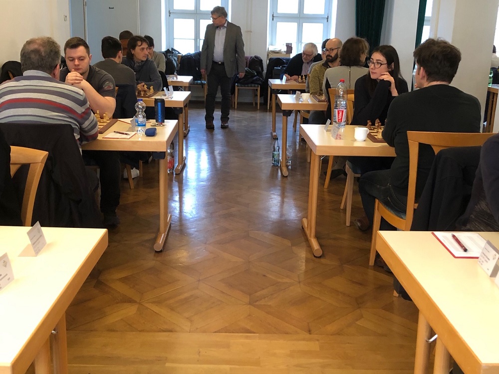 Als letztes gab Schindli sein optisch minimal besseres Endspiel Remis. Mit dem Abtauschfranzosen wurde sehr anspruchslos eröffnet und Schindli hatte auch keine Probleme auszugleichen. Er stand immer etwas angenehmer, aus dieser Struktur etwas herauszuholen ist aber nicht so einfach. Es verschwanden immer mehr Figuren vom Brett, das Remis war folgerichtig.