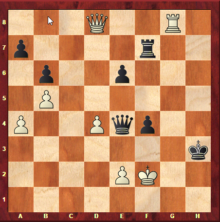 Nach langem ermüdendem Kampf übersah er jetzt die entscheidende Ablenkung der schwarzen Dame von d4 via 49.Th8+ Th7 50.T:h7 D:h7 51.Dg5!, wonach das Bauernendspiel nach 51...Dh4+ gewonnen ist. Stattdesssen folgte sofort 49.Dg5, wonach Schwarz Dauerschach hat.