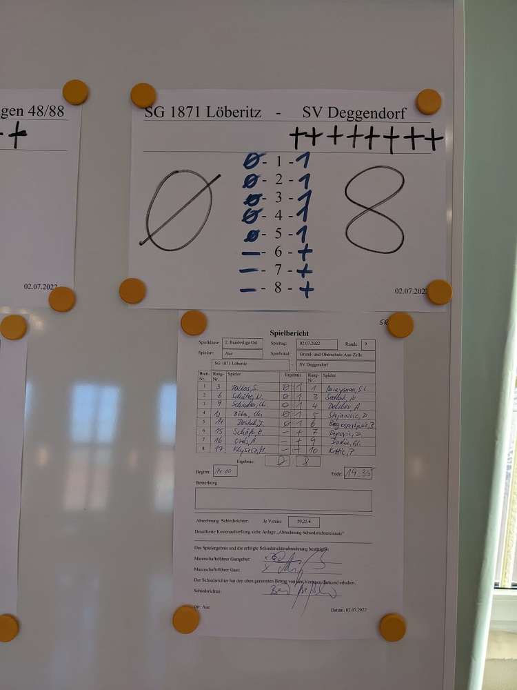 Die schachliche Geschichte unseres Kampfes könnte man schnell erzählen. Nach 30 min 3:0 Rückstand und in den 5 laufenden Partien im Schnitt 380 Elopunkte weniger = 8:0. Aber ganz so trivial lief die Sache dann doch nicht. Denn an den Brettern warfen wir, wie schon die gesamte Saison, alles in der Waagschale. Aber wie auch in den Matches davor, nutzten wir unsere Chancen nicht.
