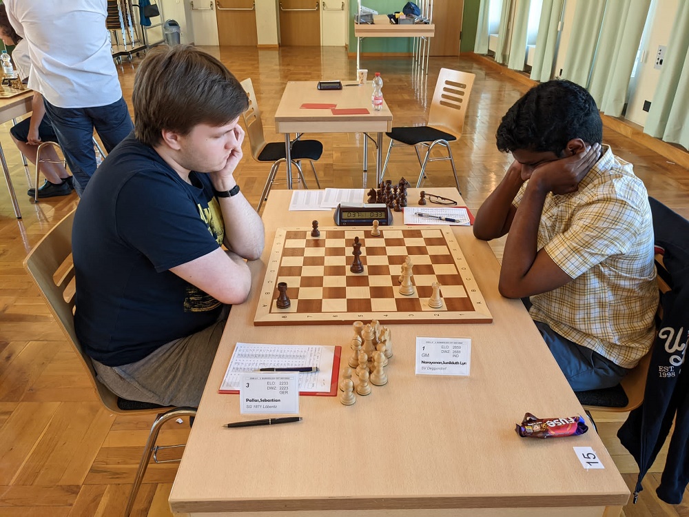 Sebastian spielte eine starke Schwarzpartie gegen Narayanan (Elo 2659) und verteidigte sich lange gut. 400 Elopunkte + zahlen sich aber doch aus und so wurde es ein sehr kritisches Endspiel, in welchem aber Narayanan einen kleinen Trick übersah und prompt in einem eigentlich totremisen Turmendspiel landete. Aber Fahrer sein und lange intensive Partien verteidigen zehrt auch an junger Substanz uns so entschied sich Sebastian unnötiger und, bestimmt im Nachgang auch für ihn selbst, unverständlicher Weise die Türme zu tauschen, was in einem klar verlorenem Bauernendspiel resultierte.