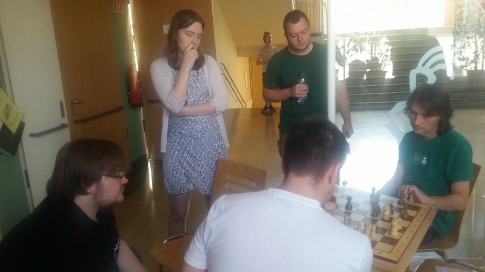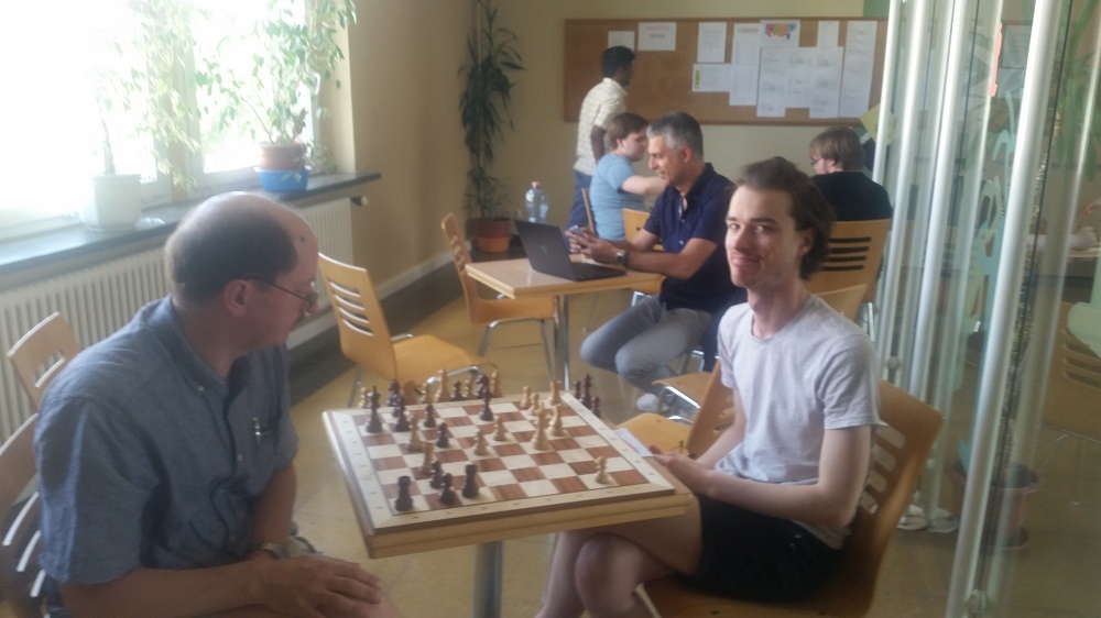Joey durfte gegen Grünfeld antreten und war (zumindest nach meinem Wissensstand) lange in der Theorie. Er hielt sein Zentrum intakt und drang mit einem Turm auf die 7. Reihe ein. Der typische Grünfeld-Delroy entpuppte sich zunehmend als Stärke und hielt Schwarz auf den letzten beiden Reihen fest. Wenig später entstand ein reines Turmendspiel, wo Joeys Figuren (vor allem der König) deutlich aktiver als ihre Gegenüber waren. Der bereits erwähnte Freibauer besorgte den Rest.