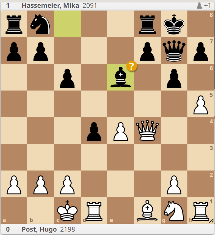 Post - Hassemeier nach 14 ...Le6: mit Sf3 die Stellung offen zu halten wäre stärker gewesen, als 15. h6 | Post - Hassemeier nach 28 ...Kc8: der Schwarze König steht auf c8 leider ziemlich sicher |
