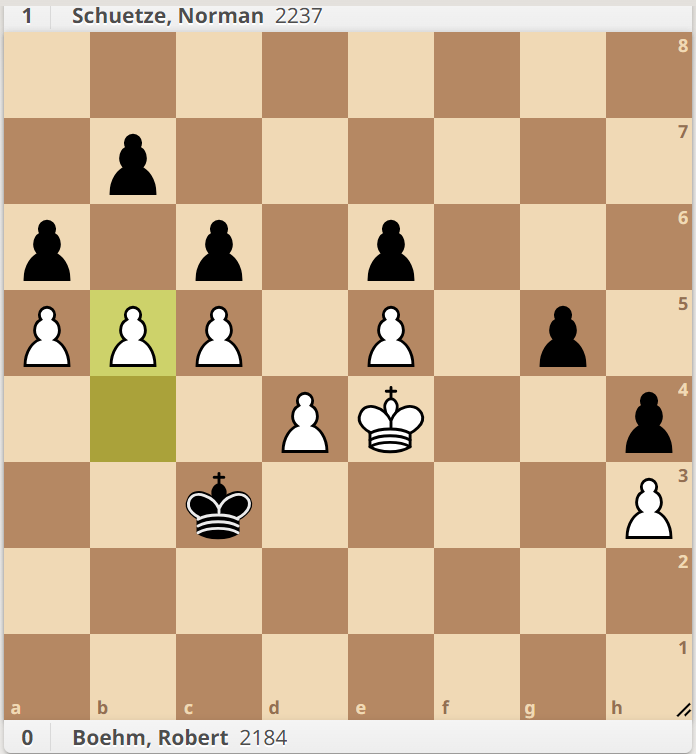 An Brett 3 spielte Schütze gegen Böhm. Im Katalanen mit verzwickter Zentrumsstruktur (weiße Bauern: d4, e3, e5, f4, schwarze Bauern: d5, e6, e4) probierten beide Seiten den jeweils anderen König anzugreifen. Als daraus nichts wurde, ergab sich ein objektiv ausgeglichenes Damenendspiel. Das sahen auch die Spielenden so, also musste das Bauernendspiel herhalten, um den Sieger zu finden. Im 60. Zug leitete Weiß den entscheidenden Durchbruch ein … allerdings ging die Rechnung nicht auf und Normi bot sich die Möglichkeit, die remis geglaubte Partie für sich zu entschieden. Das ließ er sich natürlich nicht nehmen und gewann somit unsere letzte Partie der Saison nach 7 Stunden Kampf.