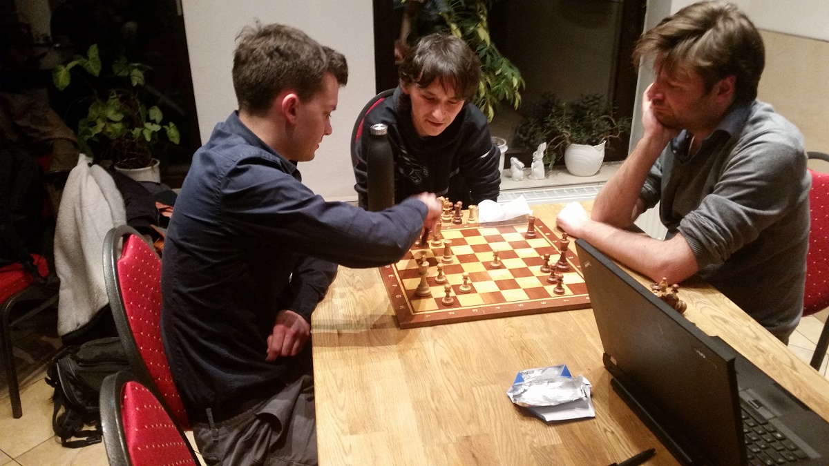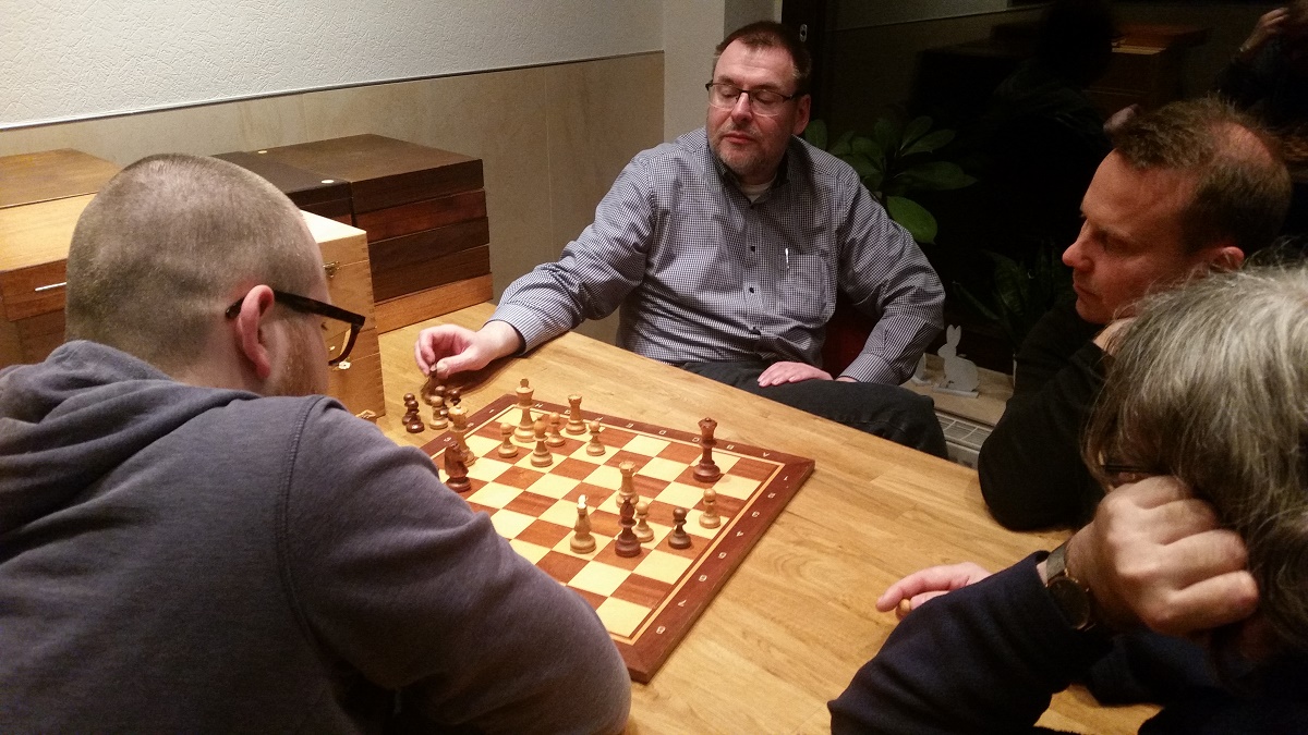 Böhmi startete unsere Aufholjagd gegen Matthias Hörr. Ihm gelang eine gute Partie, was nach einigen unglücklichen Ausgängen zuvor besonders erfreulich ist. Zwar konnte er die Glanzpartie seines Trainers nicht kopieren, aber einige schwierige stille Züge sicherten Mehrbauer und vorteilhaftes Endspiel. Es galt noch ein Freeze zu überstehen und gegnerische Hilfe beim Entknoten in Anspruch zu nehmen – dann war der Anschluss geschafft.