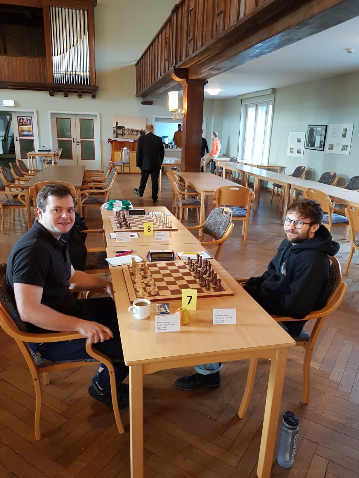 Am ersten Brett traf Robert mit den weißen Steinen auf Vincent Spitzl. Nach einer ruhigen Eröffnung gelang es Robert, einen Springer auf d6 zu installieren. In der Folge verteidigte sich Vincent gut, und hatte die Möglichkeit mit 32...Dxe5 seinerseits in Vorteil zu kommen. Stattdessen folgte ein Endspiel, indem Weiß zwar eine Qualität weniger hat, aber dafür einen Bauern mehr und aktives Spiel besitzt. In einer spannenden Zeitnotphase ließ Robert wohl einige Gewinnmöglichkeiten aus. Allerdings fand er einen Weg, in ein Turmendspiel mit gleichen Bauern abzuwickeln, in dem der schwarze König sich aber in einem Mattnetz befindet! Aufgrund des drohenden einzügigen Matts gab sich Schwarz geschlagen. Doch war das Mattnetz zur Bestürzung von zunächst Robert und dann Vincent nicht Matt, sondern Patt! Mit 59...Te1 hätte Schwarz sich retten können, denn das Schlagen des Turms lässt die Partie sofort friedlich enden. Robert behielt ein Pokerface und nahm so den ganzen Punkt mit.