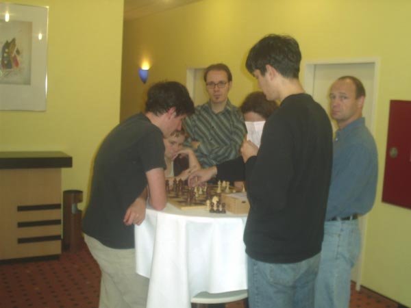 Zur sechsten Spielstunde kam ich beim Gipfel in Halle an. Merseburg muss zu diesem Zeitpunkt schon einige Chancen vergeben haben und es sah sehr gut für Halle aus, die 4:2 führten. Bewundernswert trotzdem die Coolness von Thomas Puls, der (zwar in sehr guter, aber ressourcenreicher Stellung) Remis ablehnte, obwohl Michael Feldmann gegen Katja Mädel sehr schlecht stand. Am Ende kamen tatsächlich vier Damen aufs Brett, die auch bis zum Schluss nicht getauscht wurden. Eigentlich eine Lars-Peter-Heineck-Stellung, aber man hatte nie das Gefühl, Weiß würde die Übersicht verlieren. Ein würdiges Finale und sicher ein Fall für den Partienteil. Dass Katja ihr gewonnenes Endspiel nicht nach Hause brachte, hatte schließlich (vorerst) nur statistischen Wert. Ein spannendes Spitzenspiel, das wohl insgesamt knapper verlief, als es das Ergebnis wiedergibt. Erwähnenswert noch, dass Halle tatsächlich Heinz Liebert aufbot, obwohl es theoretisch eine Überschneidung von einer Stunde mit der Senioren-WM-Auftaktpartie gab. Hier der Bericht aus Merseburger Sicht.