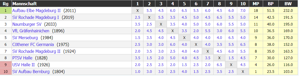 Allerdings ist die Tabelle noch verzerrt, da beide Magdeburger Teams erst ein Spiel absolviert (und gewonnen) haben. Eine vollständige Begradigung erfolgt wohl erst im Januar. Momentan lohnt noch keine Detailbetrachtung.
