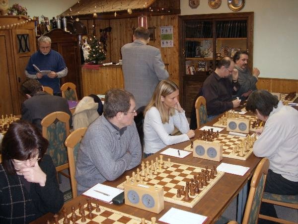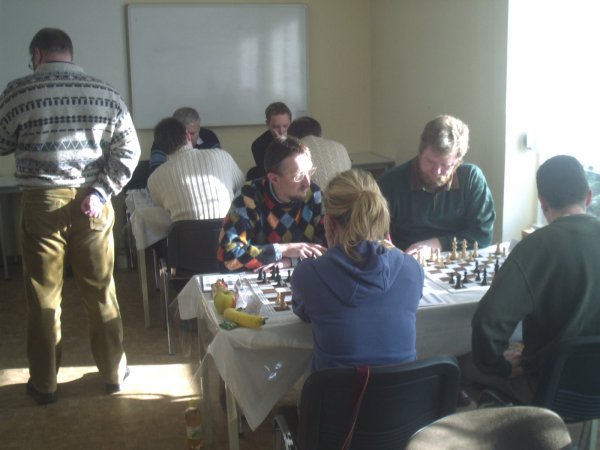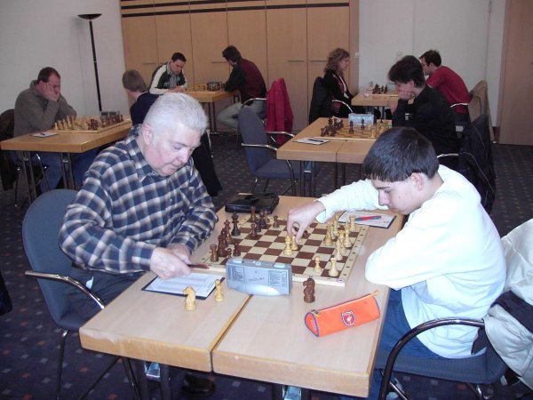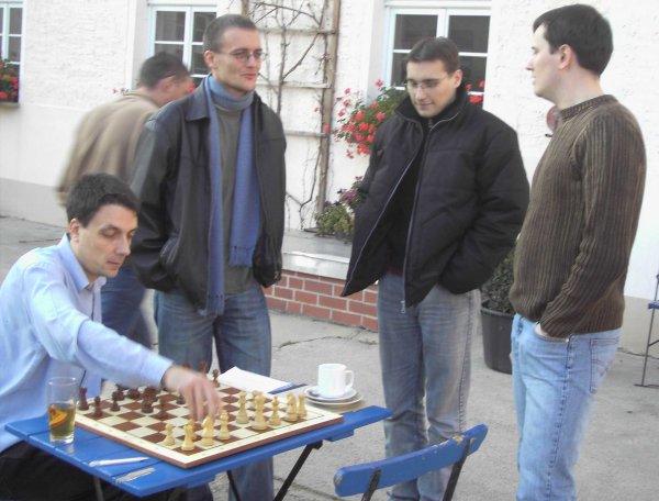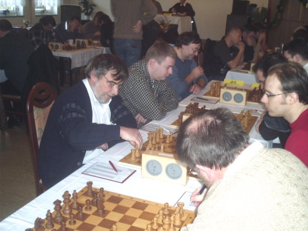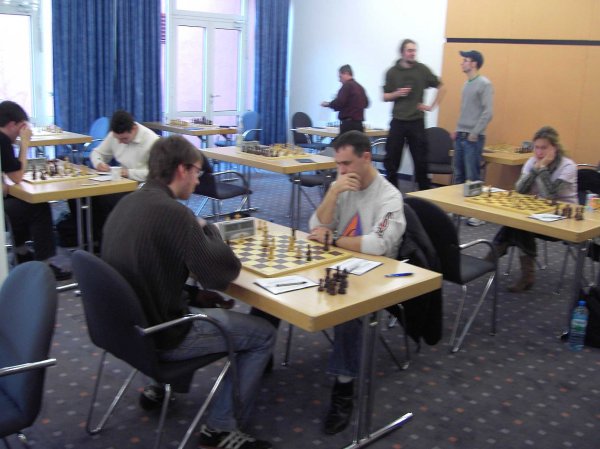 20.02.06: Keine Veränderungen an der Spitze – alle drei Mannschaften punkten voll und Dresden behält seinen Minimalvorsprung. Bedingt durch die räumliche Nähe und Quasi-Doppelrunde in Halle war der Brettpunktekampf an der Spitze (der sich bald als symbolisch erweisen kann) diesmal hautnah mitzuerleben (wir kiebitzten beim Dresdner Match, das eine Stunde später begann). Bei der Zeitüberschreitung von Andreas Domaske gegen Felix Graf (sehr klar besseres bis gewonnenes Turmendspiel für Andreas bei genügend Wartezügen) waren wir live dabei. Digitaluhr beim Kontrollzug gedrückt, aber nicht richtig erwischt – Zeit läuft weiter, ZÜ. Tragisch, aber solche Dinge oder ähnliche Dinge passieren – durchaus auch zu Dresdner Ungunsten, wenn man an das AEM-Match denkt. In Halle musste Dresden neben Selten-Spieler Alexander Goldberg auch Wolfgang Uhlmann und Jakob Loxine ersetzen. Weitere Einzelheiten zu diesem Kampf bei uns im Forum.