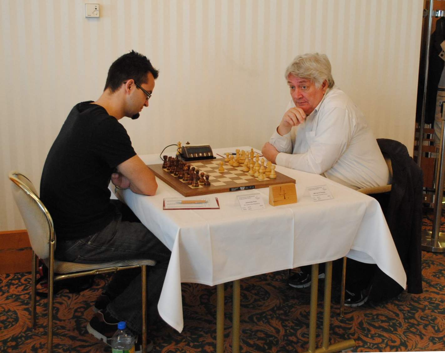 Im Parallelvergleich sah es nicht anders aus. Auch hier waren interessante Partien zu verfolgen, doch am Ende kam der Gastgeber nicht um eine Höchststrafe herum. Sehenswert und mit Zuschauern dicht umlagert war die Partie zwischen Jan Timman und Johannes Paul. (Anm. der Redaktion: Timman bezwang in dieser Variante im Jahr 2000 Morozevich, wählte allerdings im 11. Zug ein anderes Hauptabspiel.)