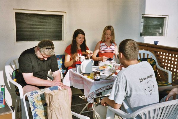 On their round the joggers Riker & KlN have picked some rolls. The picking habits in the region are trashed out during the sunlit breakfast. After the exchange of addresses the Cologne car, extended by Master Lü, leaves for Leipzig. Whereas for the hosts clubfeet are waiting. They will not anymore step into this day in Leipzig.