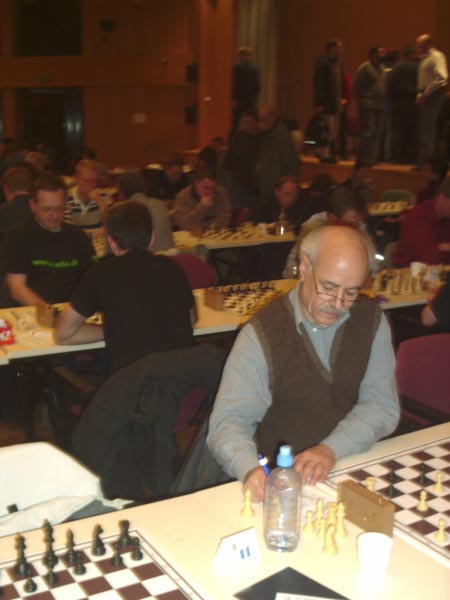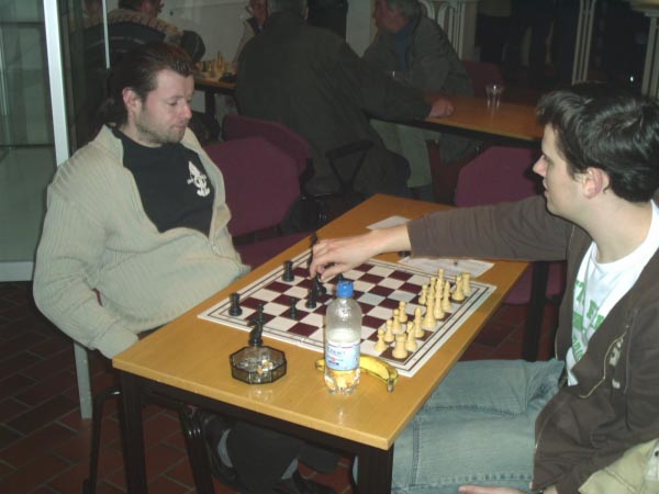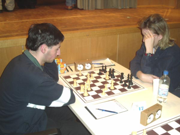 Wir kommen aber pünktlich an, und es ist soweit - Effi darf auf die Bühne. Am Brett 8 mit Weiß gegen Kupreychik, gerade beim Mittagessen hat FCB seinen Namen erwähnt, laut FCB stand der Großmeister aus Weißrussland gegen ihn schon mal auf Verlust, aber gewann trotzdem (Anm. der Redaktion: FCB hat die Partie bereits online kommentiert). Kupreychik spielt eine seltene Variante im Nimzo-Indisch (keine Neuerung, wie ich zuerst dachte; in der Mega04 gibt es 10 Partien mit diesem Zug), Effi findet seinen Tritt nicht, und wickelt das ganze in ein leicht schlechteres, aber trotzdem ausgeglichenes Endspiel. Doch dann begeht Effi den Fehler, und geht auf eine Variante, wo er nach 5 Zügen einen Bauer verliert. Dabei hatte er ja alles berechnet, aber seinen eigenen Bauern auf b2 übersehen - den hat Effi auch nicht wieder gesehen. Danach hat Effi die Partie eigentlich aufgegeben, aber zum Erstaunen von Weuni, in der Zeitnotphase, wo er nur 5 Sekunden für 2 Züge hatte, sich zurückgelehnt und ruhig weitergespielt. Weuni sagt nach der Partie, er habe erwartet, dass Effi auf dem Partieformular ZÜ eintrage, so interessiert an der Stellung sah er aus.