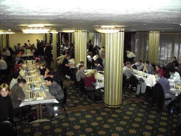 Nun, da der "sportliche" Teil von allen Kleinmeistern, jenen, die es werden wollten oder nicht konnten und solchen, die es nie werden wollten, aber vielleicht konnten, absolviert ist, mag ein kurzer Blick darauf gerichtet sein. Das Turnier teilte sich in zwei A- und je ein B- und C-Turnier auf, wobei sich die ABs (A1, A2, B) einen separierten Saal am westlichen, also Kreml-Flügel teilten (B vor-, A nachmittags) und C mit einem Raum offen zwischen einer Rezeption, einer Bar, einem Intourist-Schalter und dem Internet-Cafe vorlieb nehmen durfte. Dabei war die Bar unmittelbar angrenzend und nur etwa zur Hälfte durch einen hauchdünnen Vorhang leicht sichtbeschränkt.