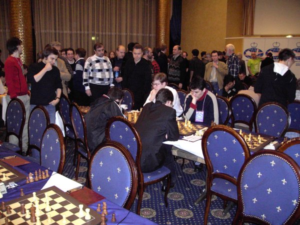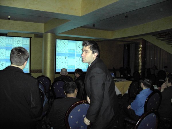 wenngleich nicht immer gut aktualisierten Abbildung der ersten 20 Bretter, von denen jedoch lediglich die ersten 3 nicht auch ansonsten gut einsehbar gewesen wären. Das Gestühl indes verschaffte immerhin Stehpausen. In Runde 4 begab es sich, dass grand maitre Ivanchuk höchstselbst vor diesen Monitoren Platz nahm um sein eigenes Doppelturmendspiel mit Minusbauer gegen Kharlov in Augenschein zu nehmen, bis er abrupt aufstand, zum Brett zurückkehrte und .. aufgab. Auf Luxus a la Ramada durfte weitgehend verzichtet werden. Weder gab es irgendwo einen Aushang der Startrangliste, so dass zur Ermittlung beispielsweise der gegnerischen Elo ein Internetbesuch erforderlich wurde, noch gab es Namensschilder, Analyseräume oder etwa sonst einen möglichen Service rund um die Turniere, mal abgesehen von freien Wasser- und Colaflaschen aus dem Kühlschrank für die Spieler, solange der jeweilige Vorrat reichte.