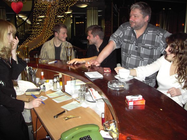 Es handelt sich um jene Bar, die alsbald zur Hauptsammel- und Verweilstätte für Dennis, Jacob, Jens und mich wurde, nicht zuletzt auch wegen höchst amüsanter, weil äußerst sprachloser Flirtereien mit Julya und Sash jenseits des kleinen Tresens. Für den schmalen Dennis zählten die beiden unter anderem am Sonntag zwischen Mittag und Abend innerhalb von weniger als sechs Stunden schlappe zehn Halbe! Kein Wunder, dass er dann erstmal eine etwa dreistündige Auszeit nehmen musste um wieder fit für die nächtliche Klubrunde zu werden.