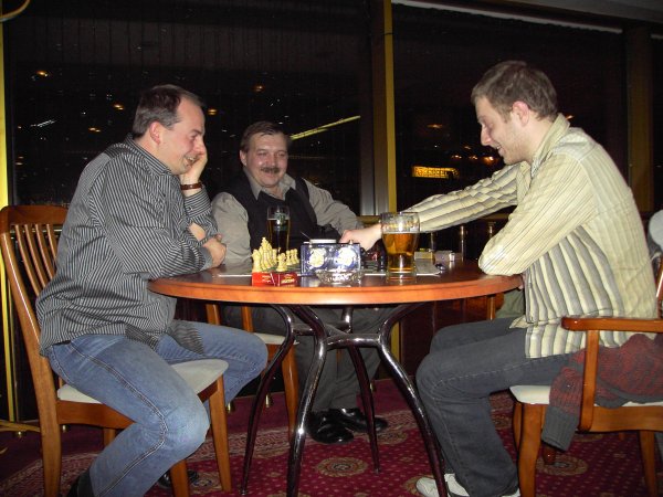 ohne auch nur einen einzigen Gegner mit Elozahl, was mich in den Genuss brachte, das Gemetzel wenigstens ohne Wirkung auf das Maß aller Caissten absolvieren zu dürfen. So blieb rasches Abhaken und die Pflege einer jovialen Grundhaltung klar begünstigt. Eine komplette Runde mit Freundschaftspartien, eine Schachreise nach Moskau und ich hätte sämtliche Partien ebensogut in einem Cafe spielen können! "Goldene Zeiten", die durch die beharrliche Senkung des Pegelstandes nicht mehr sehr lange möglich sein dürften. Nicht ausgeblieben sind dennoch natürlich die Nachanalysen aller Partien, zuletzt auch häufig gemeinsam noch mit den beiden Jungs aus dem skandinavischen Vorposten und fast immer bei gleichzeitiger Einnahme körperlicher