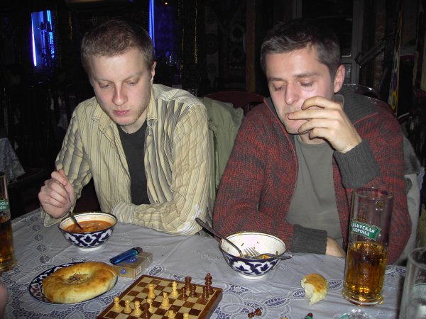 Am Freitag nimmt uns ein anderes Lokal, noch unmittelbar vor der irrtümlich chinesischen Mauer als vorletzte Gäste auf. Das Personal ist noch beschwingt von den Hochzeitsgesellschaften des Abends. Kurz darauf nehmen am Nachbartisch Ponomarjov und Ivanchuk (der wenige Stunden zuvor mit der Niederlage gegen Kharlov den möglichen Turniersieg einbüßte) Platz, während wir unermüdlich die Partien des Tages auseinandernehmen. Ihnen entgehen die Reste des schmackhaften Büffets und nur Ivanchuk riskiert beim Gehen einen flüchtigen Blick auf die aktuelle Stellung.