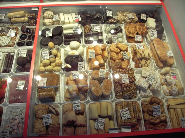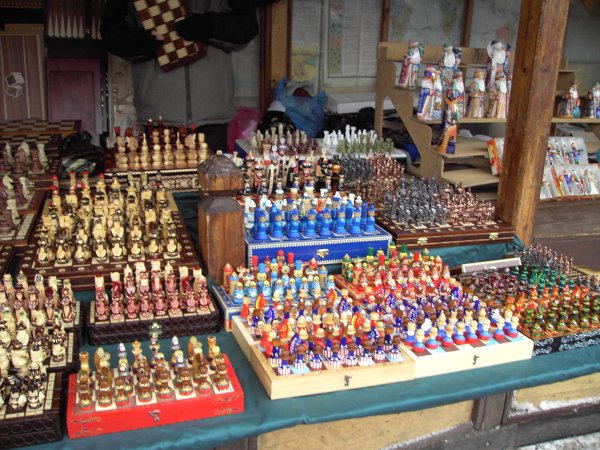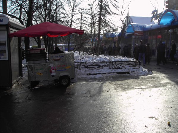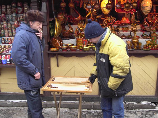 Holzbebauung vor. Dort zieht uns magisch eine Grillphalanx an. Herrlich üppige Spieße aller Art locken. Wir ziehen uns in die Hütte zurück, wo es warm ist und laben uns, natürlich biergespült, an der ersten festen Nahrung eines jeden seit 48 Stunden. Mit inniger naturalistischer Befriedigung geht es dann zum Handeln, was bei CDs und DVDs (auch aufgrund der offensichtlichen Vorliebe vieler Moskauer für den Soundtrack von "Kill Bill" nehme ich sie mit) angesichts des Preisniveaus unnötig erscheint und in Sachen Kleidung zuweilen auf enge Grenzen stößt. Letztlich aber tragen alle ein angemessenes Päckchen für den zyklischen Rückstrom.
