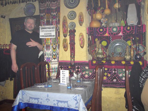 Am Mittwoch (Jens alias Master Lü alias Otze alias Uschi) und Donnerstag (Mikly) standen Doppelrunden an, was unseren übrigen Tatendrang weitgehend in die Abstellkammer sinken ließ. Aber auch das Hotel und die nähere Umgebung wollten erst einmal erobert werden. Unmittelbar an unserer Heimatmetrostation "Kitaij Gorod" fanden wir das usbekische Restaurant "Azuja", welches offenbar kurios einfach den Namen des nächstens in die Moskwa fließenden Flüßchens "Jauza" umdrehte. Nach den Leckereien ergab sich das Problem, dass wir nicht zahlen konnten, denn Jens' Annahme, überall würden auch Dollars
