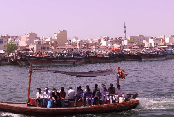Telefon! Huch, wie spät ist es? Andi und Rolf warten unten im Foyer. Wir sind zu einem Bummel durch das ursprüngliche Zentrum "Bur Dubai" verabredet. Zum Glück sind die beiden Internet-Zugänge im Hotelfoyer gerade frei, so dass sich die Jungs während meiner Schnelldusche hinreichend beschäftigen können. Eines der Pendelboote bringt uns auf die andere Seite, wo direkt ein kleiner Souk wartet. Aber nein, wir wollen kein "Burj al arab" als Mini-Plastik und das auch nach dem zehnten Überlegen auf die zehnte Frage nicht. So viel, allerdings immer noch relativ verhaltene Aufdringlichkeit sind wir von Deira nicht gewohnt. Dafür erinnern uns die zahlreichen Werbeschilder für
