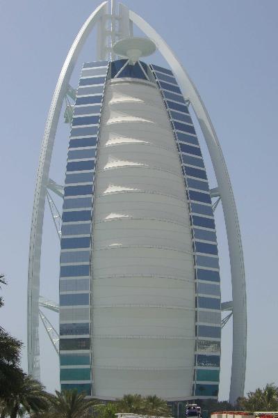 Nach verschiedenen Erfrischungen des Körpers im großen Bade, der Seele im Palmensande und des Geistes im literarischen Baku, verabschieden wir neuerlich Rolf und ziehen weiter in Richtung "Dubai Marina". Lassen wir das als riesige Brandungswelle gestaltete "Jumeirah Beach Hotel", vormals Wahrzeichen Dubais, noch ziemlich achtlos rechts liegen, so bringen wir beim Anblick des neuen Wahrzeichens, dem 7-Sterne-Segel "Burj al arab", unser Taxi am Erlebnisbad "Wild Wadi" zum Stocken. Hier ist ohnehin Endstation. Wer sich dem Hotel aller Hotels weiter nähern will, muss mit einer Registrierung an den Wachen vorbei und wird mit