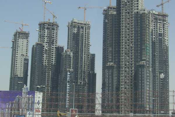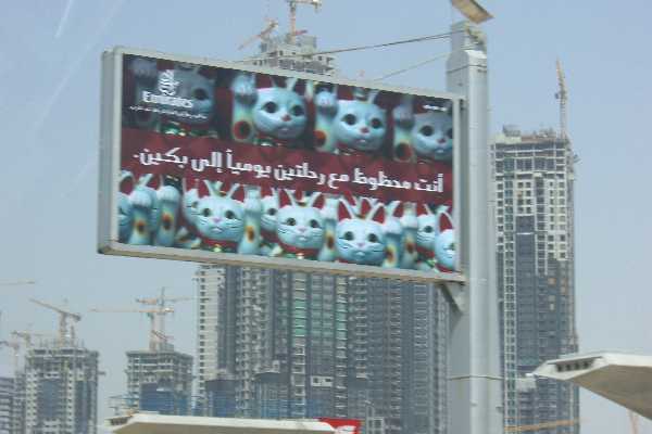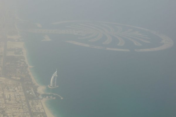 Über dem Wasserspiegel schweift der Blick und trifft auf markante Kunstwerke. Nicht zu übersehen das u/c (under construction), also im Bau befindliche dereinst höchste Gebäude ("endgültig!" wie die Promoter beharrlich behaupten) der Welt und natürlich das nahe gelegene "Burj al arab" sowie die schon weit fortgeschritten fertig gestellte künstliche Inselwelt "The Palm-Jumeirah". Ein Stückchen weiter im Meer unverkennbar die Aufschüttungsarbeiten für ein weiteres gewaltiges Projekt: Das Artefakt einer Inselgruppe in Form der Weltkarte - "The World"! Die arabischen Ambitionen haben sicher schon längst