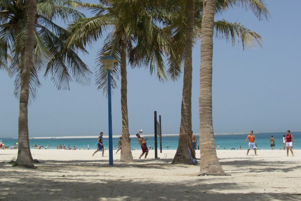 entern und gemächlich über die sich schier endlos ziehende Uferstraße "Al Jumeirah Road " gleiten, vorbei an den zahllosen Villen der Prominenten und Reichen sowie dem "Dubai Ladies Club" bis zum "Jumeirah Beach Park". Gegen eine geringe Eintrittsgebühr gelangen wir durch eine parkartige Anlage auf das Strandareal und finden noch eine halbwegs schattenspendende Palme für unser Lager. Runter die Klamotten und ab ins salzig-warme Nass!