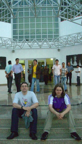Wieder ordentlich gekleidet stehen die nächsten Aufgaben des Turniers an. Eine gemischte Bilanz ist nicht zwangsläufig negativ. Rolf erhält gegen meinen Gegner aus der 2. Runde aufgrund dessen Eröffnungszugumstellung ein rasches Remis, Andi startet im Keller seinen finalen Siegeszug und ich vergesse in der Eröffnung eine wichtige Nuance und gehe hernach gegen den emiratischen FM Ishaq Ahmed elend zugrunde. Während einer der marmorierten Rauchpausen ergibt sich dafür eine kleine Plauderei mit dem iranischen Nationaltrainer. Deutschland, ja! Er habe einmal in Hamburg und bei der Olympiade in Siegen gespielt! Ich nehme mir vor, ihn bei der nächstbesten Qualmerei um ein Interview zu bitten.