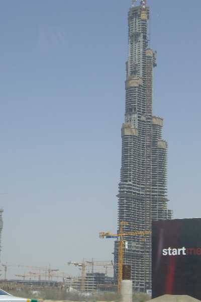 eingepflanzten Creek-Querung "Maktoum"-Brücke, über die ebenso trostlos wie endlos wirkende Finanz-Meile "Al Zayed Road". Hier entstehen neben den bereits situierten "Emirates Towers" und "Dubai World Trade Center" eben jener Gigant "Burj Chalifa" und an die hundert weitere Kolosse gleichzeitig! Beim Passieren des "Burj Chalifa"-Fragments erzählt unser Fahrer, das oberste Stockwerk, momentan noch nur ein paar Kubikmeter reiner Luft, sei bereits an eine italienische Firma verkauft. Preis: 15 Millionen US Dollar.