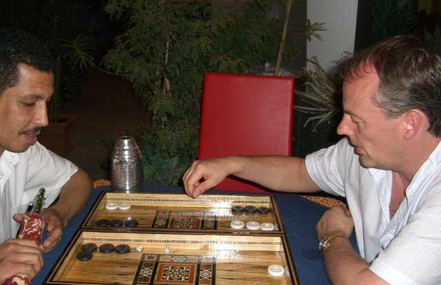 Schließlich ist meine sang- und klanglos verlorene Turnierwette gegenüber Andi abgetragen. Er verabschiedet sich und ich ziehe weiter. Doch ich komme nicht weit. Schon am Ende des gastronomischen Blocks werde ich aufgehalten. Zwei Kellner einer Bar vertreiben sich draußen rauchend die Zeit mit Backgammon. Kaum zugeschaut bin ich bereits vereinnahmt. Mein Gegenüber ist Ägypter und zu Wetten aufgelegt. Während der Partien kommt es öfter zu eifrigen Wortgefechten mit seinem syrischen Partner, der mit mancher spieltaktischen Entscheidung meines Kontrahenten nicht einverstanden zu sein scheint. So verdiene ich mir immerhin einen weiteren Drink.