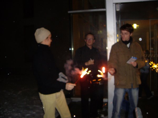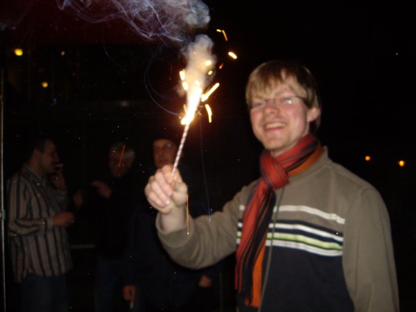 Paul hat ein paar Knaller und Bengalsches Feuer mitgebracht und so gehen wir kurz vor die Tür. Verdeckt von den Bäumen sehen wir auch das Feuerwerk in der Stadt. Lange kann man draußen aber