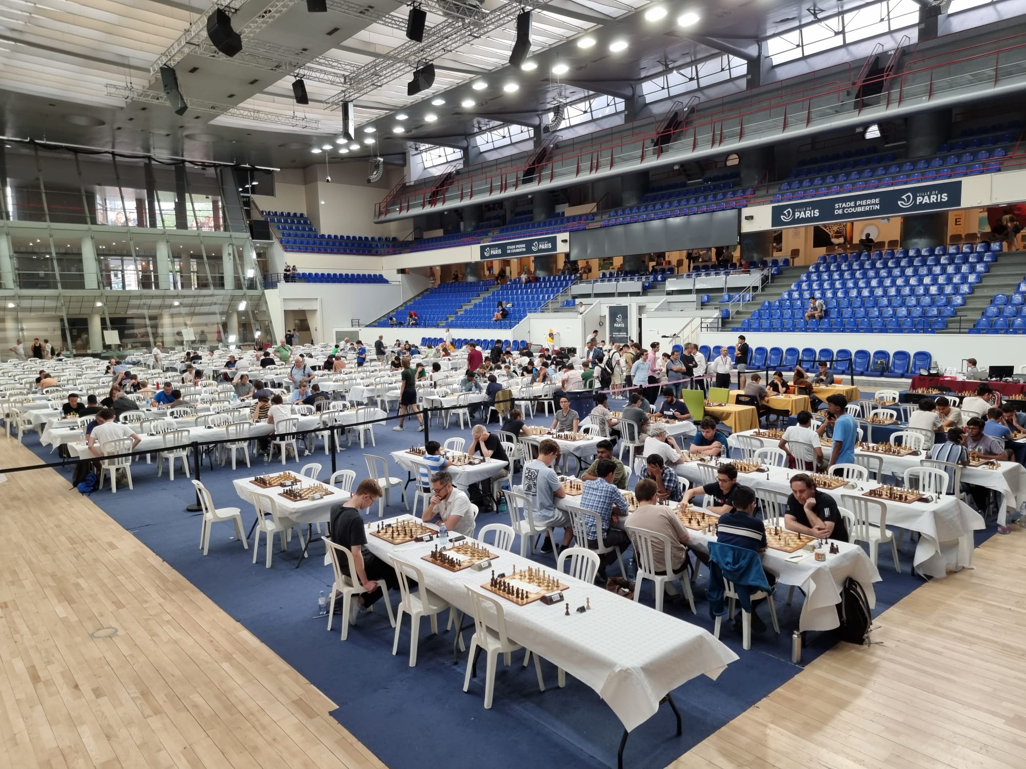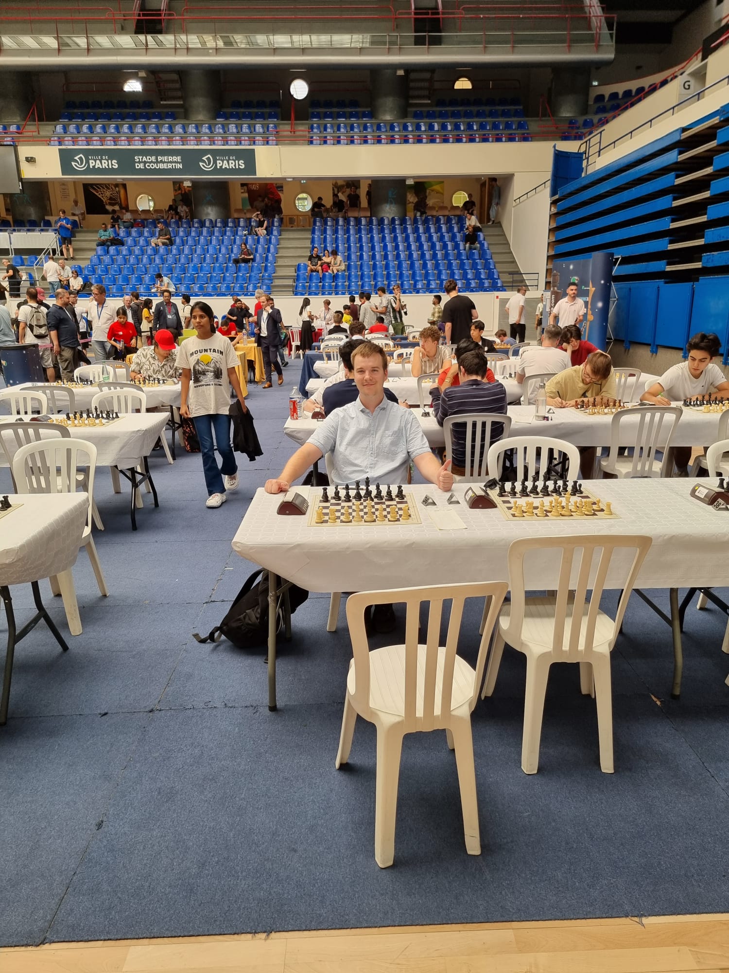 Die Anreise per Flixbus von Halle via Hannover nach Paris verlief ohne Komplikationen, so dass wir überpünktlich am Ziel eintrafen. Nach einem typisch französischen Frühstück (Croissant und Kaffee) machten wir uns zum Spiellokal, um uns zu registrieren. Dort angekommen, wurden wir mit einer unangenehmen Realität konfrontiert: Die Fassade (in dem Fall das Spiellokal) machte viel her. Gespielt wurde in einer Halle, die letztes Jahr Wettkämpfe der Olympischen Spiele beherbergte. Wenn man allerdings hinter das Äußere blickte, stieß man auf Folgendes: Gartenstühle aus Plastik? Papiertischdecken? Jahrealtes Spielmaterial? Keine Klimaanlage oder Lüfter bei über 30°C und ca. 800 Teilnehmern? Sanitäre Anlagen, wo mal wieder feucht durchgewischt werden sollte? Herz, was willst du mehr?